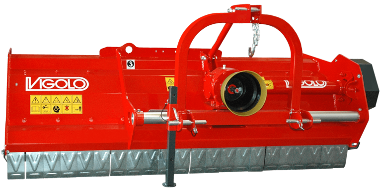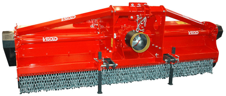 L’equipaggiamento standard di tutti i trinciastocchi Vigolo include la protezione anteriore mediante bandelle in acciaio zincato che formano una barriera solida e sicura contro la fuoriuscita del materiale trinciato. In alternativa è disponibile anche l’opzionale protezione anteriore a catene.